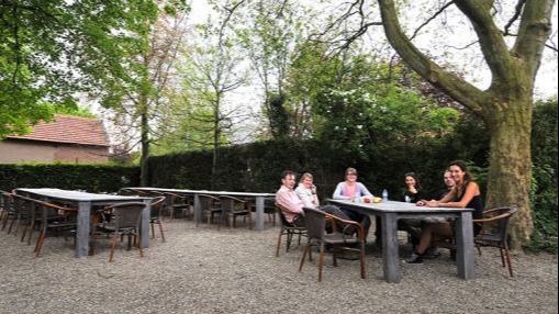 Groepsverblijf Het Klieschop – de plaats waar vroeger de klaver en het hooi als veevoer werden bewaard – heeft op de begane grond een open keuken en een ruime verblijfsruimte met openslaande deuren naar een bloemen rijk en beschut zonnig terras. Ideaal voor wat kleinere groepen.