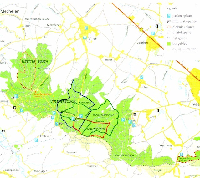 De Vijlenerbossen, gelegen in zuidoost Limburg, maken deel uit van een aaneengesloten bosgebied van ongeveer 3.000 hectaren gelegen in Nederland, België en Duitsland. Het Nederlandse deel van dit gebied beslaat ruim 600 hectaren. Hier liggen bossen met plaatselijke namen als het Preusbos, Schimperbos, Malensbos, Kerperbos, Vijlenerbos en Elsetterbos. Het is een heuvelachtig gebied met als hoogste punt het drielandenpunt bij Vaals dat 322,50 meter boven NAP ligt. NAP staat voor Normaal Amsterdams Peil, de gemiddelde waterhoogte bij Amsterdam. Ter vergelijking: het meest westelijke deel van de bossen ligt slechts 150 meter boven NAP. In de Vijlenerbossen treft u een uiterst gevarieerde planten- en dierenwereld aan. Tel hierbij op de aanwezigheid van reuzen keien, holle wegen en de diverse mooie vergezichten dan is niet moeilijk te begrijpen waarom dit gebied zo aantrekkelijk is voor recreanten.